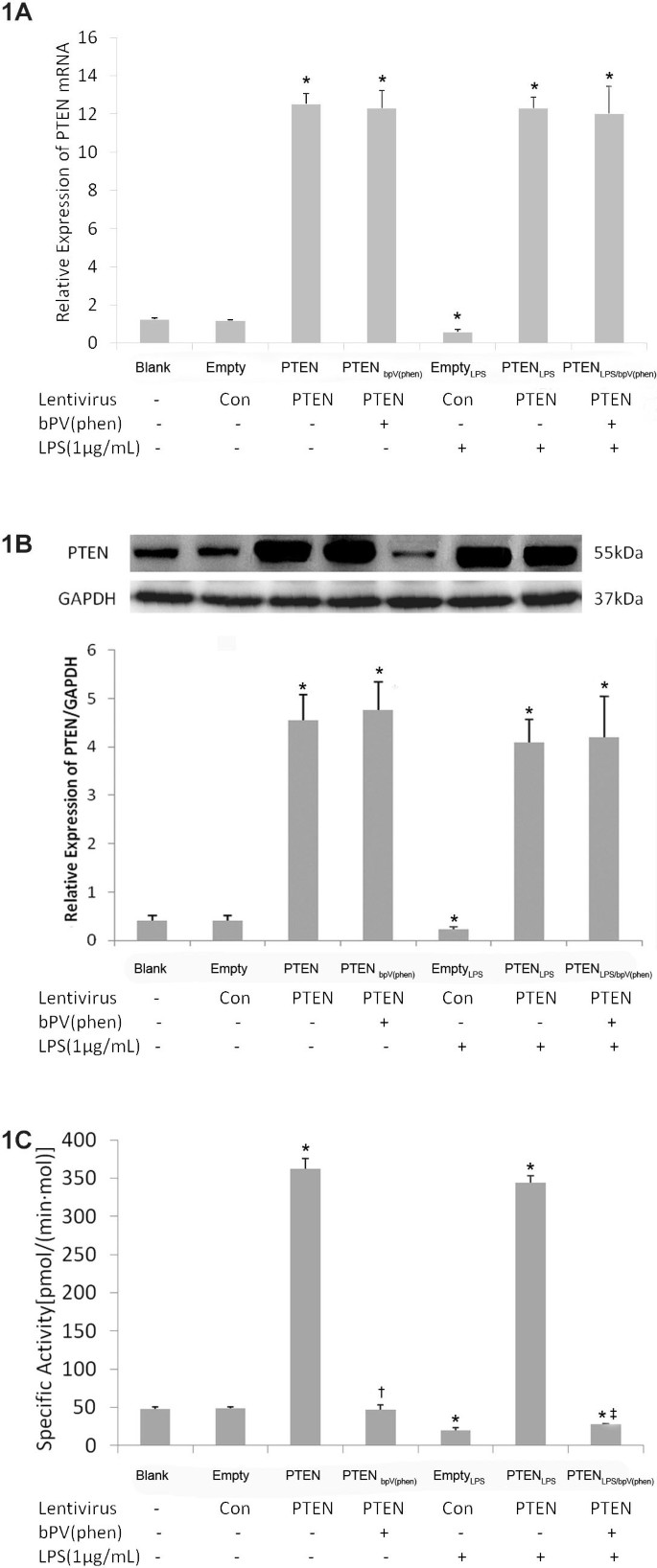 实验目的:构建PTEN过表达的小鼠原代肺成纤维细胞模型,验证LPS处理及PTEN过表达对PTEN表达水平及磷酸酶活性的影响。方法细节:分离培养C57/BL6小鼠原代肺成纤维细胞,将PTEN过表达慢病毒以5×10^4转导单位(TU)/mL的浓度转染细胞48h,随后用1μg/mL LPS处理72h;设置空白对照组、空载体转染组、空载体+LPS组、PTEN过表达组、PTEN过表达+LPS组、PTEN过表达+LPS+PTEN抑制剂bpV(phen)组等;采用实时荧光定量PCR(real-time RT-PCR)检测PTEN mRNA表达,蛋白质免疫印迹(Western blot)检测PTEN蛋白表达,孔雀绿法检测PTEN磷酸酶活性。结果解读:与空载体组相比,空载体+LPS组的PTEN mRNA、蛋白表达及磷酸酶活性显著降低(P<0.05,n=3);与空载体+LPS组相比,PTEN过表达+LPS组的PTEN mRNA、蛋白表达及磷酸酶活性显著升高(P<0.05,n=3);PTEN抑制剂bpV(phen)可显著抑制PTEN过表达+LPS组的磷酸酶活性,但不影响其mRNA及蛋白表达。实验所用关键产品:PTEN过表达慢病毒(GeneChem)、LPS(Sigma)、bpV(phen)(Alexis)、实时荧光定量PCR引物、蛋白质免疫印迹一抗(CST)。