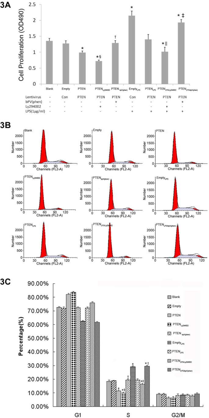实验目的:评估PTEN过表达对LPS诱导的肺成纤维细胞增殖的影响。方法细节:采用MTT法检测细胞活力,流式细胞术检测细胞周期分布;各组处理同前,MTT实验在LPS处理72h后加入MTT,孵育4h后检测OD490nm值;流式细胞术采用碘化丙啶(PI)染色,分析S期细胞比例。结果解读:与空载体组相比,空载体+LPS组的细胞活力及S期细胞比例显著升高(P<0.05,n=3);与空载体+LPS组相比,PTEN过表达+LPS组的细胞活力及S期细胞比例显著降低(P<0.05,n=3),与未加LPS的组无显著差异;PTEN抑制剂bpV(phen)可逆转PTEN过表达对细胞增殖的抑制作用,PI3-K抑制剂Ly294002可增强PTEN过表达的抑制效果。实验所用关键产品:MTT试剂、PI染色液(Sigma)、流式细胞仪(BD FACSCalibur™)。
