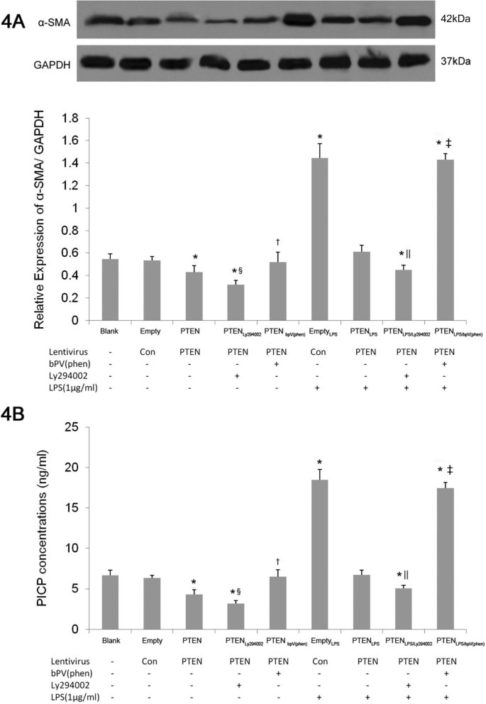 实验目的:评估PTEN过表达对LPS诱导的肺成纤维细胞分化及胶原分泌的影响。方法细节:采用蛋白质免疫印迹检测α-平滑肌肌动蛋白(α-SMA,成纤维细胞向肌成纤维细胞分化的特异性标志物)的蛋白表达;采用ELISA检测细胞培养上清中I型前胶原C端肽(PICP,I型胶原分泌的特异性标志物)的含量。结果解读:与空载体组相比,空载体+LPS组的α-SMA表达及PICP含量显著升高(P<0.05,n=3);与空载体+LPS组相比,PTEN过表达+LPS组的α-SMA表达及PICP含量显著降低(P<0.05,n=3);PTEN抑制剂bpV(phen)可逆转这一抑制作用,PI3-K抑制剂Ly294002可增强抑制效果。实验所用关键产品:α-SMA一抗(Abcam)、PICP ELISA试剂盒(Biorbyt)。