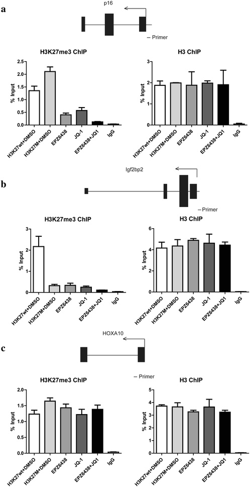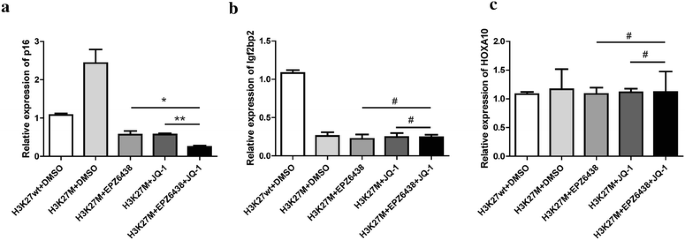 本环节的核心目标是探究联合治疗对不同表观调控模式基因的特异性作用机制。实验方法为采用染色质免疫沉淀-定量PCR(ChIP-qPCR)检测抑癌基因p16^INK4A、Igf2bp2、HOXA10启动子区的H3K27me3水平,通过实时定量PCR(qRT-PCR)检测基因表达水平。结果显示,p16^INK4A启动子区H3K27me3水平在H3K27M细胞中显著升高,单独使用任一抑制剂均能显著降低该水平,联合处理后H3K27me3完全消除,p16^INK4A表达显著上调;Igf2bp2启动子区H3K27me3在H3K27M细胞中已丢失,抑制剂处理无明显影响;HOXA10作为PRC2靶基因,其启动子区H3K27me3水平保留,抑制剂处理无显著变化,证实联合治疗可特异性调控H3K27M异常沉默的抑癌基因。