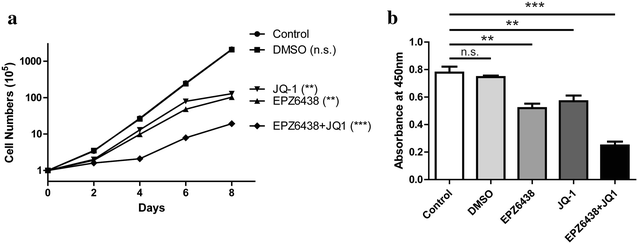 实验所用关键产品:EZH2抑制剂EPZ6438、BET抑制剂JQ-1购自Selleck Chemicals;免疫印迹所用Flag-tag、HA-tag、H3K27me3等抗体购自Sigma-Aldrich;CCK-8试剂盒购自Dojindo Laboratories。