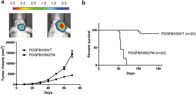 本环节的核心目标是构建模拟人类DIPG的细胞模型,验证H3K27M突变的致癌性。实验方法为从E12.5小鼠胚胎背侧前脑分离神经干细胞(NSCs),转染HA标记的PDGFB和Flag标记的H3K27M或H3K27wt,培养后采用免疫印迹(Western blot)检测H3K27me3水平,软琼脂克隆形成实验检测成瘤能力,细胞计数试剂盒-8(CCK-8)检测细胞增殖,随后将细胞原位移植到6周龄雌性BALB/c小鼠桥脑构建动物模型。结果显示,H3K27M组NSCs的全局H3K27me3水平显著降低,软琼脂克隆形成数显著高于H3K27wt组(n=3,P<0.001),细胞增殖速度更快;小鼠原位移植后,H3K27M组肿瘤体积更大,生存率显著低于H3K27wt组(每组n=20),证实H3K27M突变足以诱导DIPG发生。
