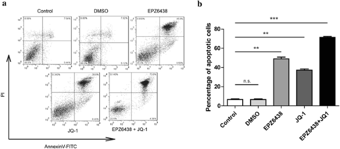 本环节的核心目标是验证EZH2与BET抑制剂单独及联合使用对肿瘤细胞增殖和凋亡的调控作用。实验方法为用EPZ6438(3μM)、JQ-1(300nM)单独或联合处理PDGFB/H3K27M NSCs,通过细胞计数和CCK-8检测细胞增殖能力,采用Annexin V-FITC/PI染色结合流式细胞术检测细胞凋亡水平。结果显示,单独使用任一抑制剂均能显著降低细胞增殖活性,联合处理后的增殖抑制效果更显著(n=3,P<0.001);单独处理可显著诱导细胞凋亡,联合处理后凋亡率进一步升高(n=3,P<0.001),证实EZH2和BET蛋白的活性对DIPG细胞生长至关重要,联合抑制可产生协同抗肿瘤效应。