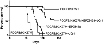 本环节的核心目标是在体内验证联合治疗的疗效。实验方法为将PDGFB/H3K27M NSCs原位移植到小鼠桥脑,肿瘤形成5天后,分别腹腔注射EPZ6438(250mg/kg)、JQ-1(50mg/kg)单独或联合治疗,每日监测小鼠生存率。结果显示,单独治疗可延长小鼠生存时间,联合治疗后150天仍有50%的小鼠存活,生存获益显著优于单独治疗组(每组n=20),证实联合治疗在体内具有显著的抗肿瘤效果。