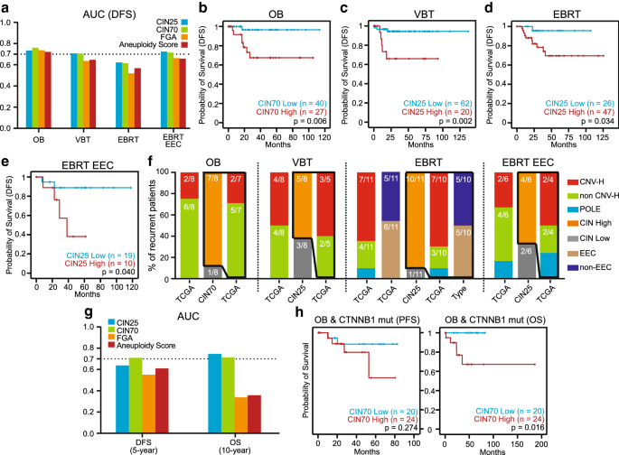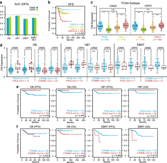 结果解读:排除POLE/CTNNB1突变后,OB亚组中CIN70的5年无病生存(DFS)AUC为0.76,CIN70高表达组预后显著差于低表达组;VBT亚组排除POLE突变后,CIN25的5年DFS AUC为0.71,高表达组5年DFS率显著更低;EBRT亚组排除CTNNB1突变后,CIN25的5年DFS AUC为0.62(整体)和0.72(子宫内膜样亚型),高表达组预后更差。此外,CIN签名的预后价值显著优于仅评估染色体内容的FGA(基因组改变比例)和非整倍体评分。