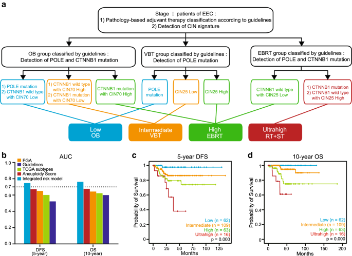 结果解读:整合模型的5年DFS AUC为0.75,10年总生存(OS)AUC为0.76,显著高于指南病理分层、FGA、非整倍体评分及TCGA分子分层系统;Kaplan-Meier分析显示,四个风险组的DFS和OS均存在显著差异(p<0.001),可分别对应观察、VBT、EBRT、放疗联合系统治疗的术后辅助治疗推荐方案。