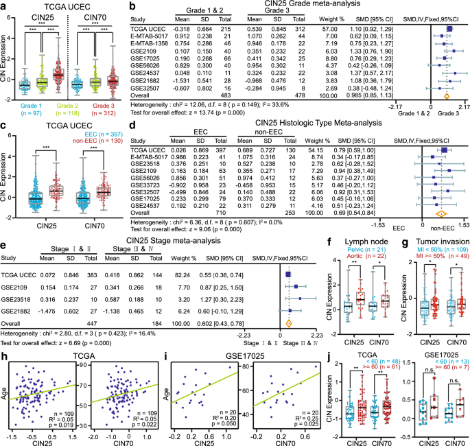 结果解读:在TCGA队列中,23例癌组织的CIN25和CIN70表达显著高于配对正常组织(CIN25:p<0.001;CIN70:p<0.001);GSE63678和GSE17025数据集也验证了恶性组织CIN签名的特异性高表达。进一步分析显示,病理分级越高(3级vs1-2级,CIN25标准化均数差SMD=0.985,95%CI 0.85-1.13,p=0.000)、非子宫内膜样组织类型、临床分期越晚(III-IV期vsI-II期,CIN25 SMD=0.602,95%CI 0.43-0.78,p=0.000)、肌层浸润越深(>50%vs<50%,p<0.05)、年龄越大(>60岁vs<60岁,p=0.0050)的患者,CIN签名表达水平越高,提示CIN与病理不良预后因素显著相关。