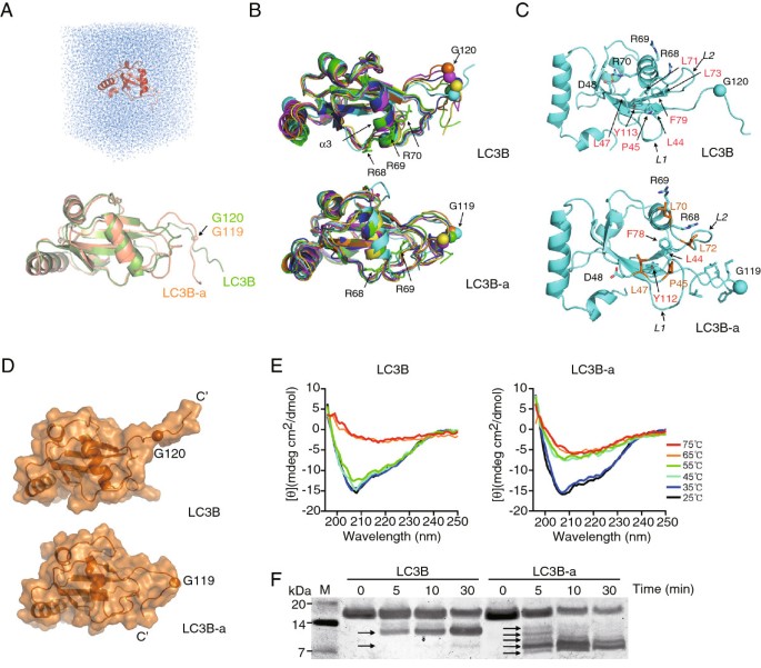 方法细节:以大鼠LC3的晶体结构为模板,通过同源建模构建LC3B和LC3B-a的初始三维结构,利用GROMACS软件进行13纳秒的分子动力学模拟;采用远紫外圆二色谱分析两种蛋白在25℃至75℃范围内的热稳定性;通过胰蛋白酶消化实验检测蛋白的构象灵活性。