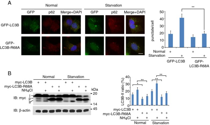 方法细节:构建GFP-LC3B和GFP-LC3B-R68A稳定表达HeLa细胞系,在正常培养及营养饥饿条件下,通过激光共聚焦显微镜观察自噬体点状结构,计数每个细胞的点状结构数量(n>100);采用氯化铵抑制溶酶体降解,通过免疫印迹检测LC3B-II的周转水平,计算自噬通量。