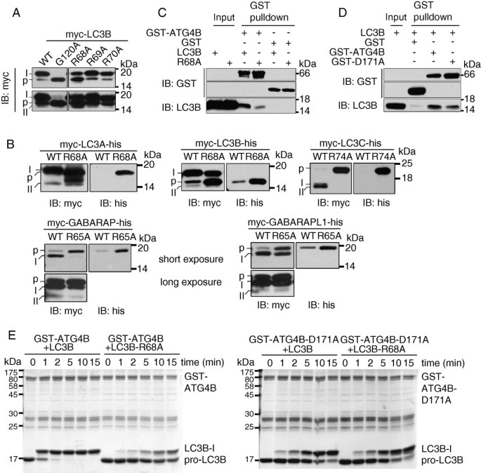 实验目的:验证Arg68是人类Atg8家族蛋白与ATG4B互作及C端切割的必需残基。