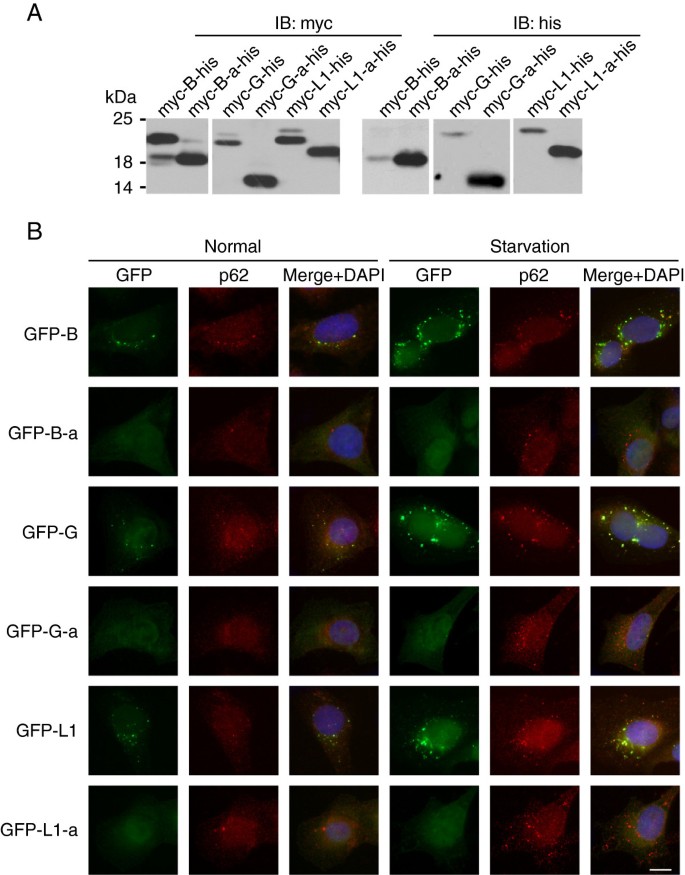 方法细节:构建N端myc标签、C端his标签的Atg8家族蛋白及剪接体融合表达载体,转染HeLa细胞24小时后,通过免疫印迹检测蛋白的翻译后修饰形式;构建N端GFP标签的融合表达载体,建立稳定表达细胞系,在正常及营养饥饿条件下,通过免疫荧光染色自噬体标记物p62,观察蛋白的细胞定位。