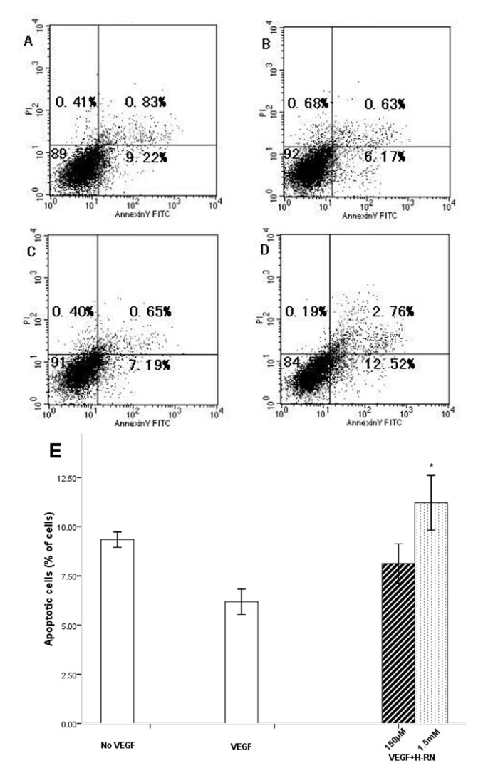 方法细节:将饥饿后的HUVEC与不同浓度H-RN(150μM、1.5mM)预孵育30min,加入VEGF(100ng/ml)处理24h,采用Annexin V-FITC/PI双染色法,通过流式细胞术检测细胞凋亡率,每组实验重复3次。