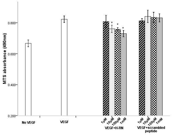 方法细节:将HUVEC接种于96孔板(4.8×10³细胞/孔),培养24h后血清饥饿过夜,随后分别用VEGF(100ng/ml)单独处理、VEGF联合不同浓度H-RN(0、1μM、10μM、100μM、1mM)或乱序肽处理24h,采用MTS法检测细胞增殖活性,每组实验重复3次。