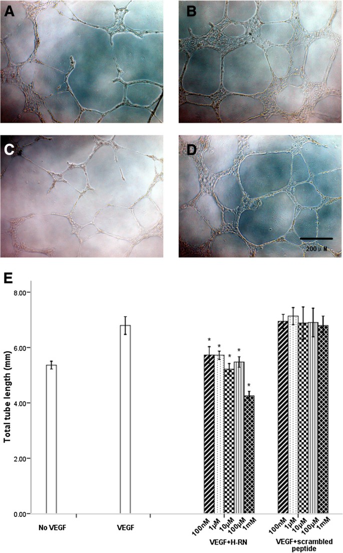 实验目的:验证H-RN对VEGF诱导的HUVEC管形成(血管样结构生成)的抑制作用。