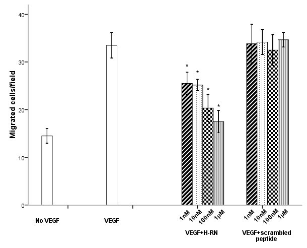 方法细节:将饥饿后的HUVEC与不同浓度H-RN(1nM、10nM、100nM、1μM)或乱序肽预孵育30min,接种于Transwell上室,下室加入含VEGF(100ng/ml)的无血清培养基,孵育24h后,用棉签去除上室未迁移的细胞,固定并染色下室的迁移细胞,随机选取5个×200视野计数细胞数量,每组实验重复3次。