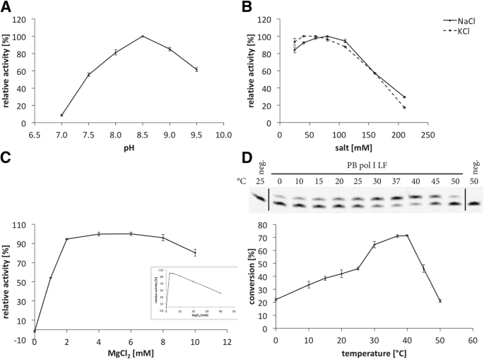 结果解读:PB pol I LF的最优反应pH为8.5,NaCl和KCl的最优浓度范围分别为40-110 mM和25-80 mM,Mg²+浓度为2-8 mM时酶活最高,无Mg²+时无聚合酶活性;该酶的最优活性温度为37℃,在25-40℃区间保持中等活性,当温度超过40℃时酶会快速失活(n=3,文献未明确提供统计学显著性P值,基于活性数据趋势判断差异显著)。