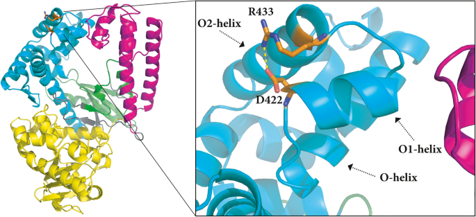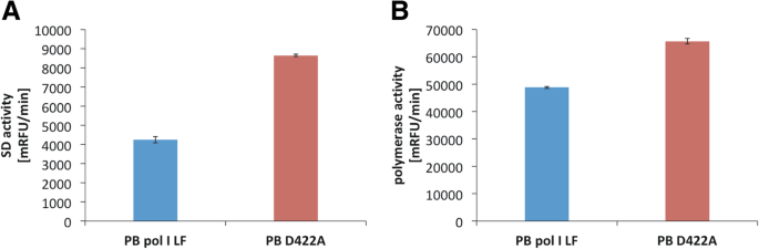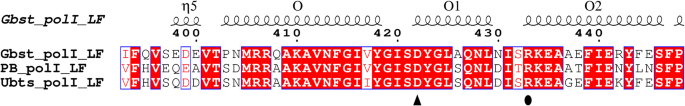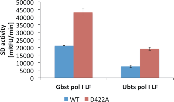 结果解读:Ubts pol I LF和Gbst pol I LF的D422A突变体链置换活性较野生型分别提升2.1倍和2.4倍;结构分析显示422位残基位于手指亚域的O1螺旋,与O2螺旋的R433残基形成盐桥,D422A突变破坏该盐桥,增加了O1螺旋区域的柔性,从而促进酶的链置换功能(n=3,文献未明确提供统计学显著性P值,基于活性数据趋势判断差异显著)。