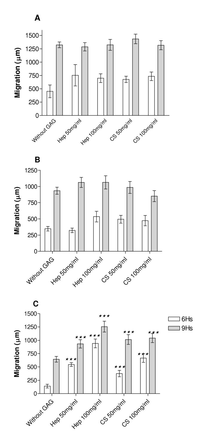 实验目的是研究糖胺聚糖对不同细胞外基质成分上C6胶质瘤细胞迁移能力的影响。方法细节为采用单层细胞迁移实验,将培养至汇合的C6细胞盖玻片转移至包被有10μg/ml细胞外基质蛋白的35mm孔中,加入不同浓度(50mg/ml、100mg/ml)的肝素或硫酸软骨素,分别在0小时、6小时、9小时检测细胞迁移出盖玻片的比例。结果解读显示,肝素和硫酸软骨素均不影响C6细胞在IV型胶原或纤连蛋白上的迁移,但显著促进细胞在层粘连蛋白上的迁移,6小时时50mg/ml肝素使迁移率提升222%,100mg/ml肝素提升567%(n=3,P<0.0001),硫酸软骨素50mg/ml使迁移率提升166%,100mg/ml提升373%。