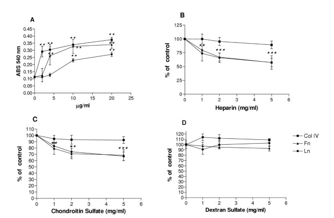 实验目的是探究肝素、硫酸软骨素、硫酸葡聚糖三种多糖对C6胶质瘤细胞与不同细胞外基质成分黏附的调控作用。方法细节为在接种C6细胞的同时加入不同浓度(1mg/ml至5mg/ml)的糖胺聚糖或硫酸葡聚糖,孵育2小时后检测细胞黏附率;同时设置细胞已黏附后添加多糖的实验,检测细胞脱离率。结果解读显示,肝素和硫酸软骨素均以剂量依赖方式抑制C6细胞与层粘连蛋白、纤连蛋白的黏附,5mg/ml浓度时肝素对两种基质的黏附抑制率均为42%(n=4,P<0.0001),硫酸软骨素对层粘连蛋白的抑制率为33.2%、对纤连蛋白为31.4%,但两者均不影响细胞与IV型胶原的黏附;硫酸葡聚糖对所有细胞外基质成分介导的黏附均无显著影响;此外,三种多糖均不会导致已黏附的C6细胞脱离基质,提示糖胺聚糖仅在细胞黏附的初始阶段发挥调控作用。