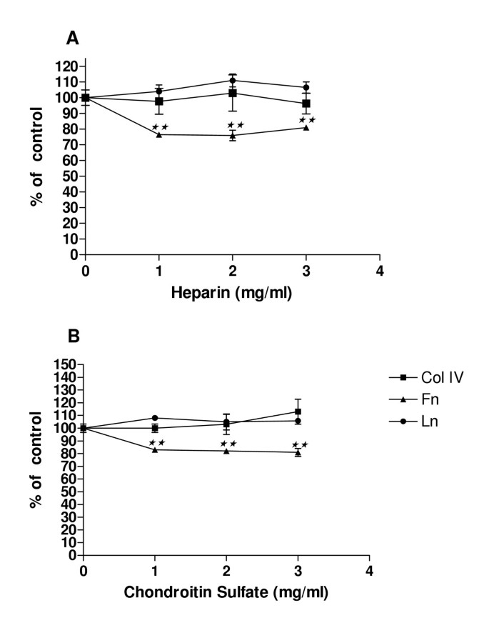 实验目的是明确糖胺聚糖对不同细胞外基质成分上C6胶质瘤细胞增殖能力的影响。方法细节为用10μg/ml的细胞外基质蛋白包被96孔板,接种C6细胞并加入不同浓度(1mg/ml至3mg/ml)的肝素或硫酸软骨素,培养2天后采用噻唑蓝(MTT)比色法检测细胞增殖率。结果解读显示,肝素和硫酸软骨素仅显著抑制纤连蛋白包被板上的C6细胞增殖,抑制率分别为24%和20%(n=3,P<0.001),但对IV型胶原或层粘连蛋白上的细胞增殖无明显影响。