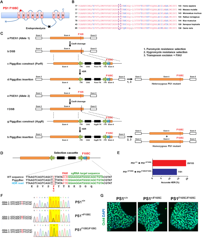 实验目的是构建无外源序列残留的PS1 F105C杂合和纯合敲入iPSC,排除个体基因组差异对实验结果的干扰。方法细节:从28岁健康中国女性尿液细胞重编程得到UC-H2-iPSCs,采用CRISPR/Cas9结合piggyBac转座子系统进行两步基因编辑:第一步在PSEN1等位基因1插入携带puro-TK筛选标记的piggyBac载体,通过嘌呤霉素筛选获得杂合突变克隆,再转染转座酶并经FIAU处理去除载体序列;第二步在杂合突变细胞的等位基因2插入携带HygR-TK筛选标记的piggyBac载体,经潮霉素筛选获得纯合突变克隆,同样去除载体序列;通过Sanger测序、核型分析、多能性标记免疫荧光染色(Oct4)及畸胎瘤形成实验验证iPSC的基因型和多能性。结果解读:成功构建了PS1 F105C杂合(18.9%克隆效率)和纯合(13.7%克隆效率)敲入iPSC,所有细胞系核型正常,多能性标记表达正常,且未检测到脱靶效应。