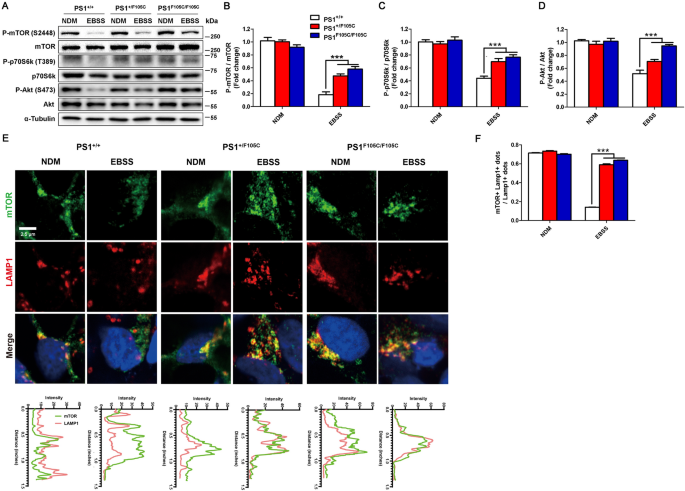 实验目的是明确PS1 F105C突变对mTORC1通路饥饿响应能力的影响。方法细节:将神经元用Earle"s平衡盐溶液(EBSS)饥饿处理4小时,通过Western blotting检测Akt、mTOR、p70S6K的磷酸化水平,免疫荧光染色检测mTOR与溶酶体标记LAMP1的共定位情况。结果解读:在正常喂养条件下,突变与对照神经元的mTOR通路磷酸化蛋白水平无显著差异;但在饥饿条件下,对照神经元中mTOR、p70S6K、Akt的磷酸化水平显著降低,而PS1 F105C突变神经元中这些蛋白的磷酸化水平仍维持在较高水平(n=3,P<0.005);免疫荧光结果显示,对照神经元在饥饿时mTOR从溶酶体膜扩散至细胞质,而突变神经元中大部分mTOR仍与LAMP1共定位(n≥30,P<0.005),表明PS1 F105C突变导致mTORC1通路对饥饿的响应性降低。
