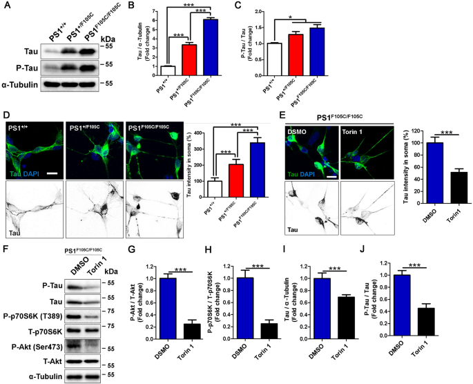 实验目的是验证mTOR通路抑制是否能清除PS1 F105C突变神经元中的tau蛋白积累。方法细节:将PS1 F105C纯合突变神经元用1μM Torin1处理2天,通过Western blotting检测总tau和磷酸化tau(At8)的水平,免疫荧光染色检测tau蛋白在神经元胞体的积累情况。结果解读:PS1 F105C突变神经元的总tau水平、磷酸化tau/tau比值显著高于对照神经元(n=3,P<0.05或P<0.005),且tau蛋白在胞体的积累量随突变拷贝数增加而升高(n≥50,P<0.005);Torin1处理后,突变神经元中Akt、p70S6K的磷酸化水平显著降低,总tau水平、磷酸化tau/tau比值显著下降(n=3,P<0.005),胞体tau蛋白积累量也显著减少(n≥50,P<0.005),表明mTOR抑制剂可有效改善PS1 F105C突变神经元的tau病理。