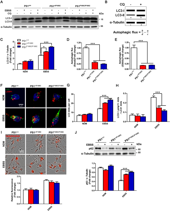 实验目的是解析PS1 F105C突变对自噬不同阶段功能的影响。方法细节:通过Western blotting检测自噬体标记LC3-II的水平,结合氯喹(CQ)处理评估自噬流;免疫荧光染色检测LC3与LAMP1的共定位情况;采用LysoTracker Red染色检测溶酶体pH,DQ-Red BSA染色检测溶酶体降解功能;Western blotting检测自噬底物p62的残留水平。结果解读:饥饿可诱导所有神经元的LC3-II水平升高,但突变神经元的LC3-II水平显著高于对照;CQ处理后,突变神经元的基础自噬流和饥饿诱导的自噬流均显著低于对照神经元(n=3,P<0.05或P<0.005);免疫荧光结果显示,对照神经元在饥饿时LC3与LAMP1大量共定位,而突变神经元中两者共定位极少;LysoTracker Red和DQ-Red BSA染色结果显示,突变神经元的溶酶体pH和降解功能均正常,但饥饿时突变神经元的p62残留水平显著高于对照(n=3,P<0.005),表明PS1 F105C突变导致自噬体-溶酶体融合障碍,进而引发自噬功能异常。