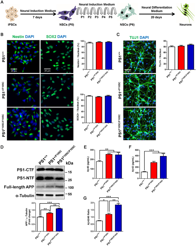 实验目的是验证PS1 F105C突变对神经元分化能力及Aβ产生的影响。方法细节:将iPSC分化为神经干细胞(NSCs),再进一步分化为成熟神经元(培养20天);采用免疫荧光染色检测NSCs标记(SOX2、Nestin)和神经元标记(TUJ1)的表达,Western blotting检测PS1剪切片段(PS1-NTF、PS1-CTF)和全长APP的水平,ELISA检测神经元培养上清中Aβ40、Aβ42的含量。结果解读:所有iPSC系分化为NSCs和成熟神经元的能力一致,PS1 F105C突变不影响PS1的内蛋白水解剪切过程,但全长APP的水平随突变拷贝数增加而显著升高;突变神经元培养上清中Aβ40、Aβ42的水平及Aβ42/Aβ40比值均显著高于对照神经元(n=4,P<0.01或P<0.005),与AD动物模型和患者的病理特征一致。