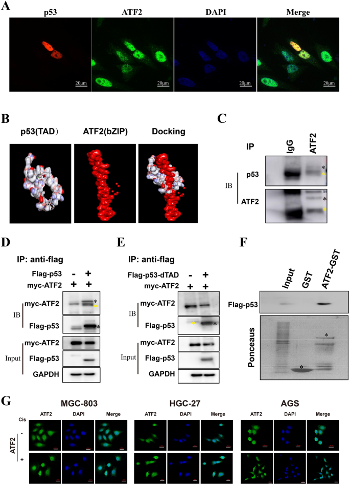 本环节旨在明确ATF2与p53的相互作用区域及亚细胞定位变化。研究采用免疫荧光共定位观察ATF2与p53的亚细胞分布,通过分子对接预测两者的相互作用结构域,结合免疫沉淀(IP)、GST-pull down实验验证直接相互作用。结果显示,ATF2与p53均定位于细胞核,分子对接显示ATF2的bZIP结构域可与p53的反式激活结构域(TAD)结合;IP与GST-pull down实验证实两者存在直接相互作用,且当p53的TAD结构域缺失时,相互作用消失;顺铂处理后,p53野生型细胞中ATF2发生核输出,定位于细胞质,而p53突变细胞中ATF2仍主要定位于细胞核。实验所用关键产品:Flag标签抗体(Abmart)、GST-pull down试剂盒(GE Healthcare)、共聚焦显微镜。