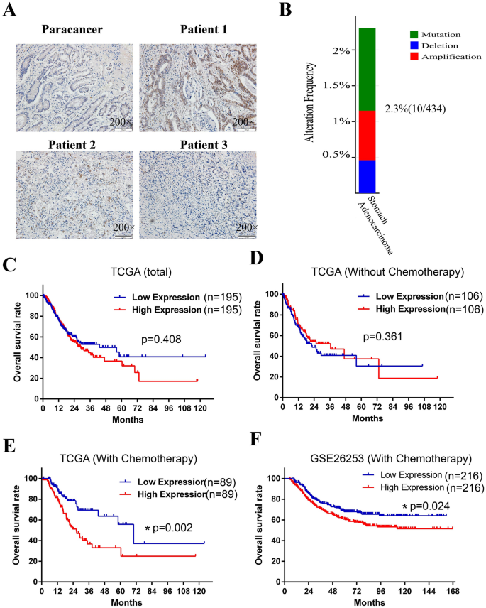 本环节的核心目标是明确ATF2在胃癌组织中的表达定位及与患者预后的关联。研究采用免疫组化检测胃癌组织中ATF2的表达与亚细胞定位,结合TCGA、GEO数据库分析不同ATF2表达水平患者的生存预后。结果显示,ATF2主要定位于胃癌细胞的细胞核,在部分患者中表达水平显著高于癌旁组织;TCGA数据库分析显示,高ATF2表达的胃癌患者总体生存率无显著差异,但接受化疗的高ATF2表达患者5年生存率显著更低(P<0.05),这一结果在GSE26253数据集中得到验证。实验所用关键产品:ATF2抗体(Santa Cruz Biotechnology)、免疫组化检测试剂盒(MaiXin.Bio)。