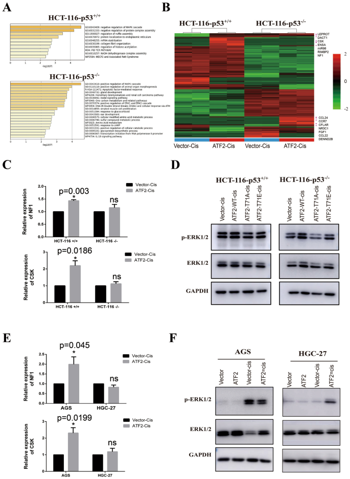 本环节的核心目标是解析ATF2依赖p53状态调控ERK1/2通路的具体机制。研究通过RNA测序分析ATF2过表达后p53野生型与缺陷细胞的差异表达基因,结合实时定量PCR、Western Blot验证关键基因的表达与ERK1/2通路的激活状态。结果显示,p53野生型细胞中ATF2过表达显著上调MAPK通路负调控因子CSK、NF1的表达,抑制ERK1/2的磷酸化激活;而在p53缺陷细胞中,ATF2过表达上调MAPK通路正调控因子,促进ERK1/2的磷酸化激活,证实ATF2通过调控ERK1/2通路介导顺铂应答的双面功能,且该调控依赖p53状态。实验所用关键产品:RNA测序服务(GENEWIZ)、TB Green定量PCR试剂盒(Takara)。