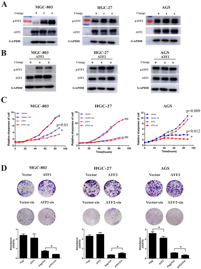 本环节旨在验证ATF2在不同胃癌细胞系中对顺铂敏感性的调控作用。研究首先通过Western Blot检测顺铂处理后不同胃癌细胞系中磷酸化ATF2(p-Thr71)的表达变化,随后构建ATF2稳定过表达细胞系,采用IncuCyte活细胞分析系统、克隆形成实验检测细胞增殖与顺铂敏感性。结果显示,顺铂以剂量依赖方式激活MGC-803、HGC-27细胞中的p-ATF2表达,但对AGS细胞的p-ATF2表达影响较小;ATF2过表达可增强AGS、MGC-803细胞的顺铂敏感性,促进细胞死亡,而在HGC-27细胞中则显著降低顺铂敏感性,促进细胞存活。实验所用关键产品:p-Thr71 ATF2抗体(Cell Signaling Technology)、IncuCyte®活细胞分析系统(EssenBioScience)。