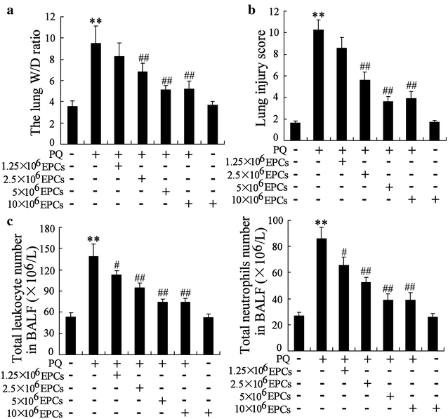 实验目的:验证内皮祖细胞对百草枯诱导急性肺损伤的治疗作用,并确定最优细胞剂量。方法细节:将C57BL/6J小鼠分为对照组、百草枯组、不同剂量内皮祖细胞治疗组,百草枯组腹腔注射50mg/kg百草枯,治疗组在注射百草枯6小时后尾静脉注射不同剂量的内皮祖细胞;检测肺湿干重比、肺损伤评分、支气管肺泡灌洗液中总白细胞和中性粒细胞数量。结果解读:百草枯组小鼠肺湿干重比显著升高(n=10,P<0.01),肺损伤评分显著增加(n=10,P<0.01),支气管肺泡灌洗液中总白细胞和中性粒细胞数量显著增多(n=10,P<0.01);内皮祖细胞治疗能剂量依赖性地逆转上述指标,其中5×10^6个细胞的治疗效果最佳,表明内皮祖细胞能有效减轻百草枯诱导的急性肺损伤。