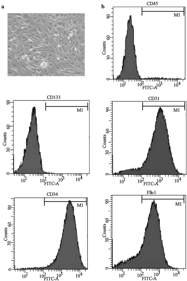 实验所用关键产品:Ficoll-Plaque Plus(Amersham Biosciences)、人纤连蛋白(Sigma-Aldrich)、EGM-2培养基(Cambrex)、乙酰-LDL(Molecular Probes)、凝集素(Molecular Probes)、流式抗体(FITC标记抗CD31、CD34、CD133,APC标记抗CD45、Flk-1)。