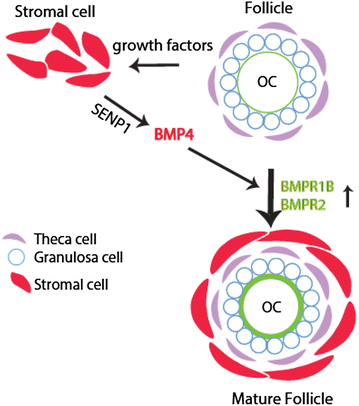 研究过程详述:SENP1的来源为小鼠卵巢SM22α阳性基质细胞,通过条件性敲除模型验证其功能;BMP4的来源为卵巢基质细胞,在人卵巢基质细胞中通过siRNA敲低SENP1后,qRT-PCR和Western blot验证其表达显著下调;特异性方面,SENP1仅调控BMP4的表达,对BMP2、BMP6等其他BMP家族成员无显著影响;敏感性方面,SENP1敲除后,小鼠卵巢中BMP4的表达水平下调约50%,卵母细胞上BMPR1B和BMPR2的表达水平分别下调约45%和50%(n=5,P<0.05)。