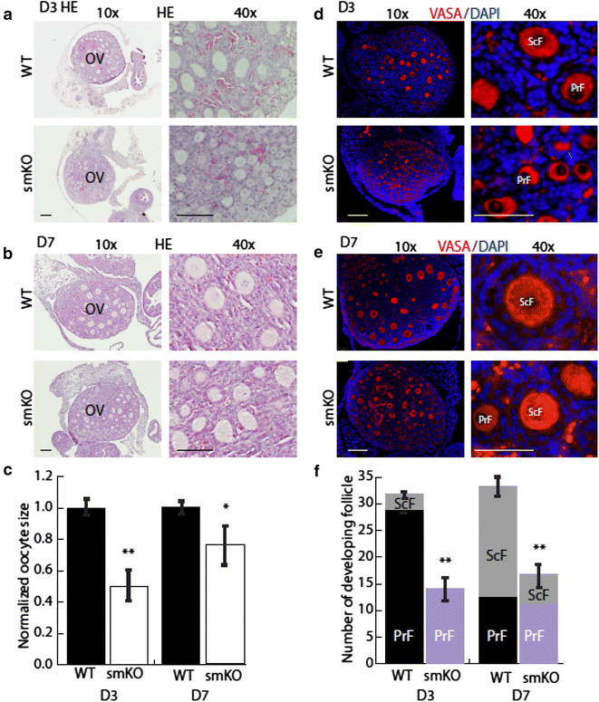 实验目的:观察SENP1敲除对小鼠不同年龄段卵巢卵泡发育的影响,明确其在早期卵泡发生及生殖寿命维持中的作用。方法细节:选取3周、6周、8个月龄的WT和SENP1-smKO小鼠,取卵巢组织进行苏木精-伊红(H&E)染色,统计原始卵泡、初级卵泡、次级卵泡等不同阶段的卵泡数量;对新生(D0)、出生后3天(D3)、7天(D7)的小鼠卵巢进行免疫荧光染色,采用卵母细胞标志物VASA和基质细胞标志物SM22α观察卵母细胞形态及卵泡结构。结果解读:H&E染色统计显示,SENP1-smKO小鼠各年龄段卵巢的总卵泡数量均显著低于WT小鼠,8月龄时WT小鼠卵巢仍可见各发育阶段卵泡及黄体,而SENP1-smKO小鼠卵巢几乎无发育中卵泡,呈现卵巢早衰表型(n=5,P<0.01);D3和D7时SENP1-smKO小鼠的卵母细胞体积较WT小约25%(n=5,P<0.05),初级和次级卵泡数量分别减少约40%和50%(n=5,P<0.01),表明早期卵泡发生过程受阻。