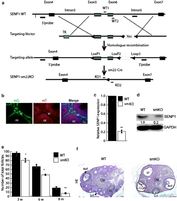 实验目的:构建SM22α阳性基质细胞特异性敲除SENP1的小鼠模型,验证SENP1在目标细胞中的敲除效率,为后续表型分析提供实验基础。方法细节:采用Cre-loxP条件性基因敲除技术,将携带loxP位点的SENP1 flox/flox小鼠与SM22α启动子驱动的Cre工具鼠交配,获得基质细胞特异性SENP1敲除(SENP1-smKO)小鼠;通过SM22α-Cre与mG/mT报告小鼠交配,验证SM22α阳性细胞在卵巢基质中的定位;从WT和SENP1-smKO小鼠卵巢中分离SM22α阳性细胞,采用实时荧光定量PCR(qRT-PCR)和蛋白质免疫印迹(Western blot)分别检测SENP1的mRNA和蛋白表达水平。结果解读:报告小鼠实验显示SM22α阳性细胞主要分布于卵巢基质区域;qRT-PCR结果显示SENP1-smKO小鼠SM22α阳性细胞中SENP1 mRNA水平较WT下调约70%(n=3,P<0.05),Western blot结果显示蛋白水平下调约65%(n=3,P<0.05),证实SENP1在基质细胞中被特异性敲除。