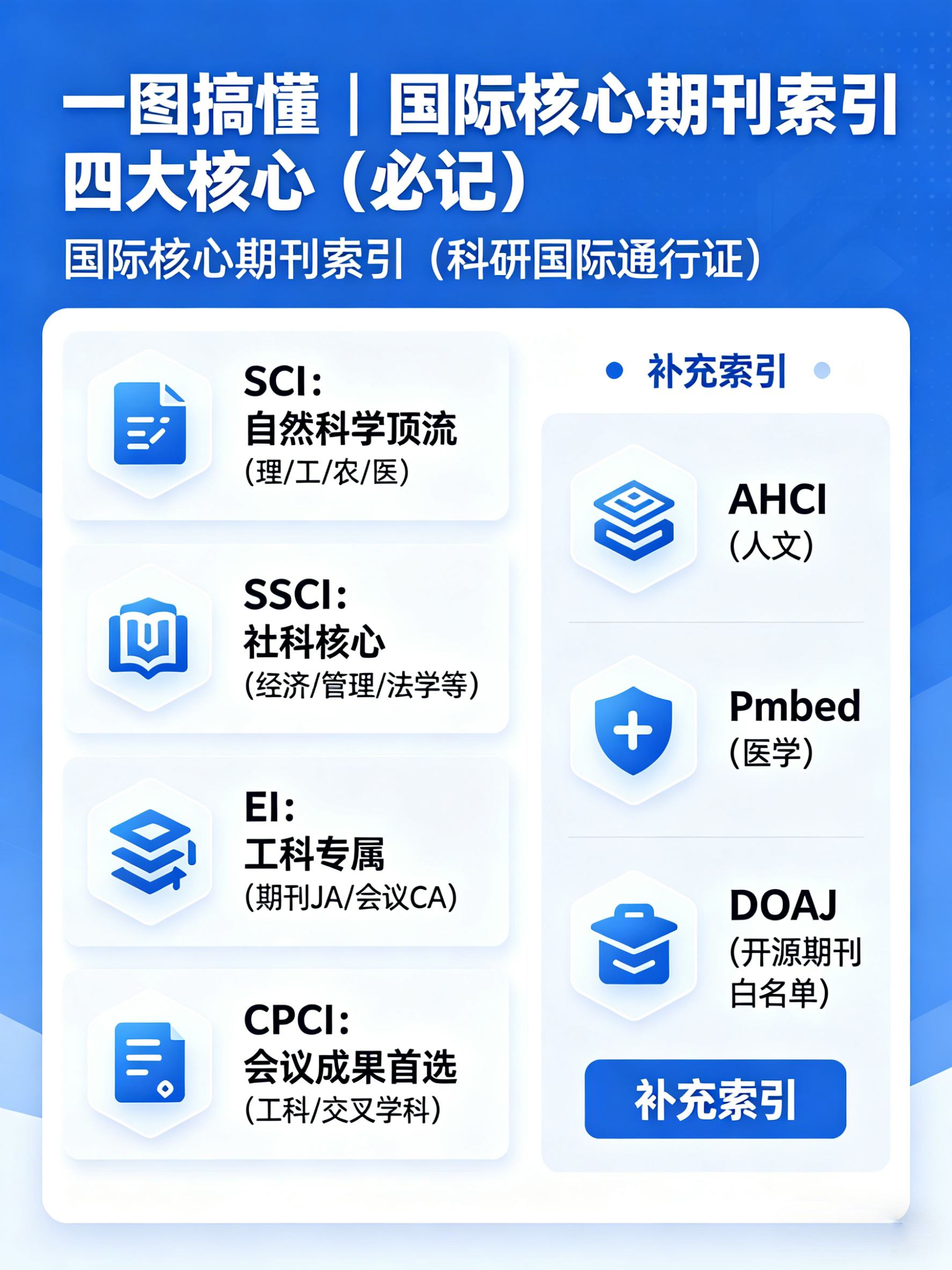 1. 区分“索引”和“期刊”:SCI、SSCI等是索引数据库,不是期刊本身,只有期刊被收录进对应索引,才具备相应含金量。