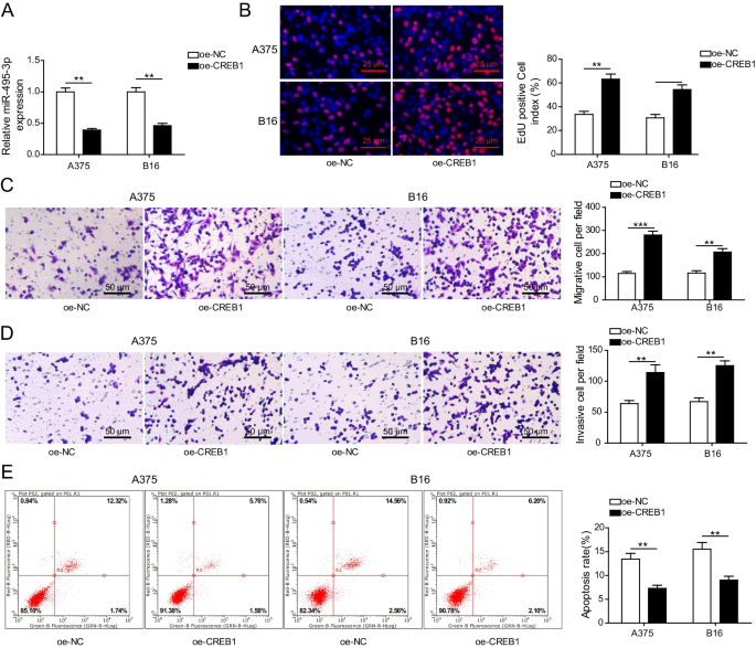实验目的是验证CREB1是否通过miR-495-3p调控KPNA2进而影响黑色素瘤细胞的生物学功能。方法细节为在A375和B16细胞中进行分组转染:对照组、CREB1过表达组、CREB1过表达+miR-495-3p模拟物组、miR-495-3p模拟物组、miR-495-3p模拟物+KPNA2过表达组,采用实时荧光定量PCR检测各组中miR-495-3p及KPNA2的表达水平,通过EdU实验、Transwell实验及流式细胞术检测细胞活力、迁移侵袭能力及凋亡率。结果解读:实时荧光定量PCR结果显示,CREB1过表达可显著下调miR-495-3p并上调KPNA2的表达,共转染miR-495-3p模拟物可逆转KPNA2的上调;miR-495-3p模拟物可显著下调KPNA2的表达,共转染KPNA2过表达载体可逆转该下调效应;功能实验结果显示,CREB1过表达增强的细胞活力可被miR-495-3p模拟物抑制(n=3,P<0.01),而miR-495-3p模拟物抑制的细胞活力可被KPNA2过表达逆转(n=3,P<0.01);迁移侵袭及凋亡实验也得到一致结果,证实CREB1通过抑制miR-495-3p转录上调KPNA2,进而促进黑色素瘤细胞的增殖、迁移侵袭并抑制凋亡。实验所用关键产品:Invitrogen的Lipofectamine 3000转染试剂,广州RiboBio的EdU染色试剂盒。