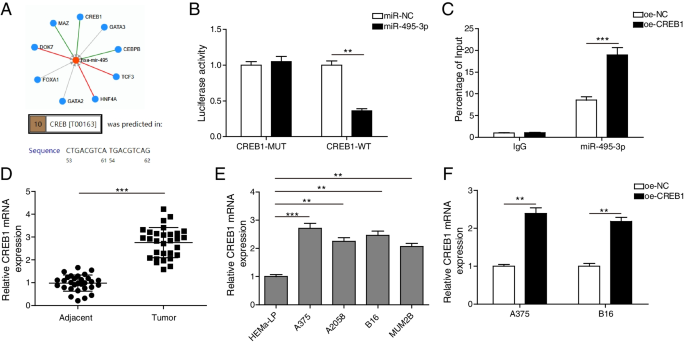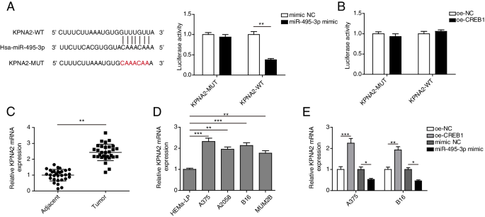 研究过程详述:miR-495-3p来源于30例黑色素瘤患者的肿瘤组织及癌旁组织、人黑素细胞系及黑色素瘤细胞系,采用实时荧光定量PCR进行表达验证,结果显示其在黑色素瘤组织中的表达显著低于癌旁组织(n=30,P<0.001),且与患者总体生存率呈负相关;CREB1和KPNA2同样来源于上述临床样本及细胞系,实时荧光定量PCR结果显示二者在黑色素瘤组织及细胞系中显著上调(n=30,P<0.001);通过双荧光素酶报告基因实验、ChIP实验验证了三者间的靶向调控关系,细胞功能实验进一步证实其对黑色素瘤细胞生物学行为的调控作用。
