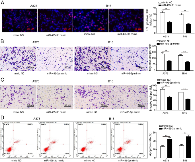 实验目的是明确miR-495-3p在黑色素瘤中的表达水平及对细胞生物学功能的影响。方法细节为收集30例黑色素瘤患者的肿瘤组织及癌旁正常组织,同时选取人正常黑素细胞系HEMa-LP及黑色素瘤细胞系A375、A2058、B16、MUM2B,采用实时荧光定量PCR(qRT-PCR)检测miR-495-3p的表达水平;随后在A375和B16细胞中转染miR-495-3p模拟物,通过EdU实验检测细胞活力,Transwell实验检测细胞迁移及侵袭能力,流式细胞术检测细胞凋亡率。结果解读:实时荧光定量PCR结果显示,miR-495-3p在黑色素瘤组织中的表达显著低于癌旁组织(n=30,P<0.001),且其表达水平与患者总体生存率呈负相关;在黑色素瘤细胞系中,miR-495-3p表达同样显著下调,其中A375和B16细胞中下调最为明显(n=3,P<0.001);转染miR-495-3p模拟物后,A375和B16细胞的活力显著降低(n=3,P<0.01),迁移及侵袭能力显著下降(n=3,P<0.01),凋亡率显著升高(n=3,P<0.01),提示miR-495-3p在黑色素瘤中发挥抑癌作用。实验所用关键产品:Invitrogen的TRIzol试剂、PrimeScript RT Reagent Kit、mirVana microRNA Isolation kits,广州RiboBio的EdU染色试剂盒,Beyotime的Annexin V-FITC/PI凋亡检测试剂盒,Beckman Coulter的MoFlo Astrios流式细胞仪。