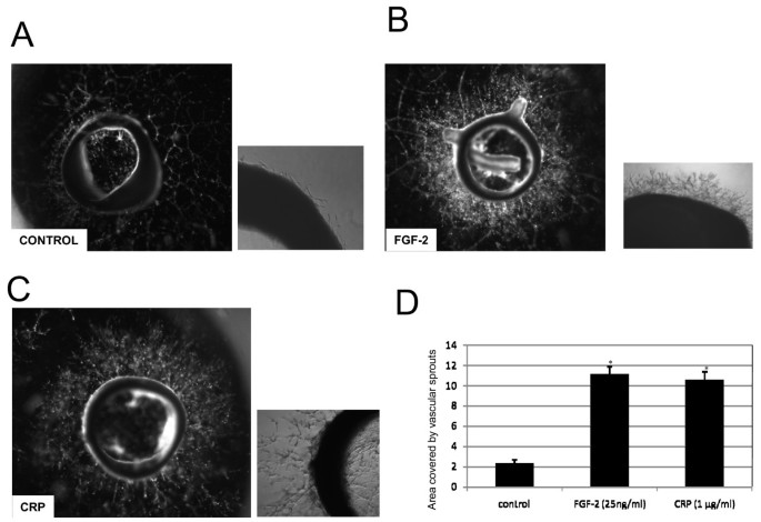 实验目的是在整体动物水平验证CRP的促血管生成作用,体内模型更接近生理病理状态。方法细节:采用鸡胚绒毛尿囊膜(CAM)实验,将5μg CRPdt应用于第7天鸡胚的CAM,培养7天后按0-3分的标准评分血管生成情况;同时采用大鼠主动脉环实验,将成年Wistar大鼠的主动脉切成1mm厚的环,接种于Matrigel上,加入1μg/ml CRPdt培养6天,测量微管出芽的面积。结果解读:CRPdt处理的CAM血管生成评分为2.0(对照组为0.5,P<0.001),形成典型的轮辐状血管结构;CRPdt处理使大鼠主动脉环的微管出芽面积从对照组的2.3±0.3增加到10.5±0.8(P<0.01),与FGF-2的效应相当,说明CRP在体内具有显著的促血管生成活性。