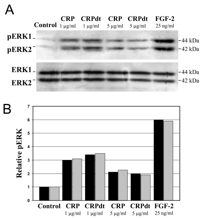 实验目的是解析CRP促血管生成的下游细胞信号通路,ERK1/2是调控内皮细胞增殖和迁移的关键信号分子。方法细节:HCAEC和BAEC经血清饥饿48小时后,用1-5μg/ml的天然CRP或CRPdt处理8分钟,采用免疫印迹法检测ERK1/2的磷酸化水平,以总ERK1/2作为内参。结果解读:CRP和CRPdt均显著增加ERK1/2的磷酸化水平,与FGF-2的效应相似,LPS和叠氮钠处理组无显著变化,说明CRP通过激活ERK1/2信号通路介导其促血管生成效应。