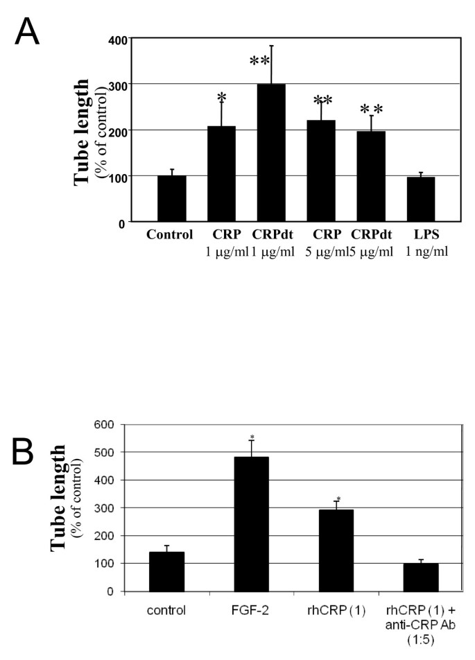 实验目的是验证CRP对内皮细胞体外血管形成能力的影响,管样结构形成是体外模拟血管生成的关键指标。方法细节:将HCAEC和BAEC与生长因子减少的Matrigel按1:1混合,加入1-5μg/ml的天然CRP或CRPdt,将混合物滴加至48孔板中形成3D凝胶滴,培养24-48小时后固定细胞,采用双盲法测量管样结构的总长度,同时设置抗CRP抗体阻断组和LPS对照组。结果解读:CRP处理使HCAEC的管样结构长度较对照组增加约4倍(P<0.01),CRPdt处理使BAEC的管样结构长度增加约3倍(P≤0.01),抗CRP抗体可显著抑制CRP诱导的管样结构形成,LPS处理组无显著变化,说明CRP可直接诱导内皮细胞形成功能性的管样结构。