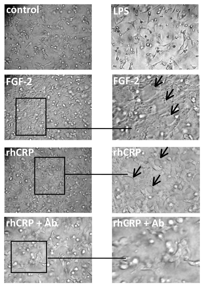 实验目的是验证CRP对血管内皮细胞迁移能力的直接影响,迁移是血管生成的关键步骤之一。方法细节:采用人冠状动脉内皮细胞(HCAEC)和牛主动脉内皮细胞(BAEC)两种原代内皮细胞模型,使用改良Boyden小室法检测细胞趋化性,设置1-5μg/ml的天然CRP和经Detoxi-Gel柱处理的去污染CRP(CRPdt),以碱性成纤维细胞生长因子(FGF-2)为阳性对照,同时设置LPS(1ng/ml)作为污染对照,此外用抗CRP抗体(1:5)进行阻断实验以验证效应的特异性。结果解读:CRPdt在5μg/ml浓度时使HCAEC的迁移率达到对照组的290%(P<0.01),天然CRP在5μg/ml时使BAEC的迁移率达到对照组的175%(P<0.001),LPS处理组无显著迁移变化,抗CRP抗体可显著抑制CRPdt诱导的HCAEC迁移,说明CRP本身而非污染成分介导了内皮细胞的趋化效应。