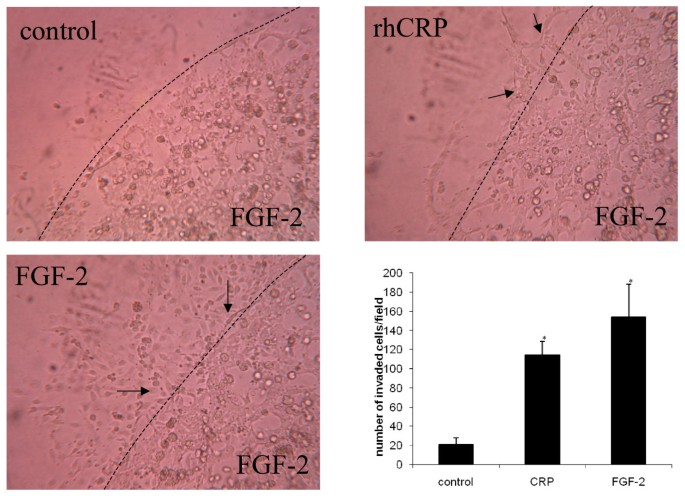 实验目的是检测CRP对内皮细胞侵袭能力的影响,侵袭是内皮细胞形成新生血管的关键步骤之一。方法细节:先让HCAEC在FGF-2存在下于Matrigel中形成管样结构,然后在其周围加入第二层Matrigel并加入1μg/ml CRPdt,培养24小时后观察细胞向第二层Matrigel的侵袭情况。结果解读:对照组HCAEC的侵袭水平较低,而CRPdt处理组可见明显的细胞侵袭进入第二层Matrigel,说明CRP可促进内皮细胞的侵袭能力,进一步支持其促血管生成作用。