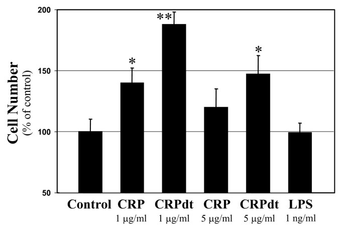 实验目的是检测CRP对不同来源血管内皮细胞增殖能力的影响,增殖是血管生成的核心环节。方法细节:将HCAEC接种于24孔板、BAEC接种于6孔板,待细胞贴壁后换用血清贫乏培养基(SPM)使细胞生长速率降低,随后加入1-5μg/ml的天然CRP或CRPdt,培养72小时后用胰酶消化细胞,使用Coulter计数器进行细胞计数。结果解读:1μg/ml天然CRP使BAEC的增殖率较对照组增加40%(P<0.05),CRPdt处理使BAEC增殖率进一步增加至对照组的180%(P<0.01),而在1-5μg/ml的浓度范围内,CRP对HCAEC的增殖无显著影响,说明CRP对不同来源内皮细胞的增殖调控存在细胞特异性。