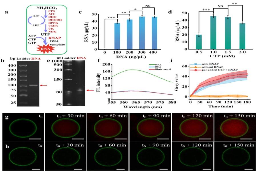 针对上述难题,韩晓军教授团队在人造细胞内实现了核苷酸从头合成代谢通路的构建,并将合成的核苷酸用于RNA转录。该代谢通路以NH4HCO3为起点合成尿苷三磷酸(UTP),包括氨甲酰磷酸合成酶(CPS)、天冬氨酸转氨甲酰基酶(ATC)、二氢乳清酶(DHO)、二氢乳清酸脱氢酶(DHODH)、磷酸核糖焦磷酸激酶(RPPK)、尿苷5′-单磷酸合成酶(UMPs)、尿苷酸激酶(UK)和核苷二磷酸激酶(NDK)8种酶。同时引入由肌酸激酶(CK)和磷酸肌酸组成的ATP再生系统以驱动该代谢途径。在优化的条件下,180分钟内可产生0.85毫摩尔每升的UTP,与CTP、GTP、ATP和T7 RNA聚合酶共同实现了人造细胞内的RNA转录。人造细胞内UTP从头合成代谢通路及其后续RNA转录的成功实现为自主人造细胞的构建奠定了坚实基础。