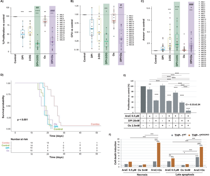 实验目的:明确NOX2抑制剂与糖酵解抑制剂联合对不同亚型AML细胞增殖、克隆形成能力及细胞死亡的影响,验证二者的协同作用。方法细节:采用泛NADPH氧化酶抑制剂二苯基碘鎓(DPI)、NOX2特异性抑制剂GSK2795039,分别联合己糖激酶抑制剂2-DG、乳酸脱氢酶(LDH)抑制剂oxamate,处理MOLM-13、THP-1等6种不同亚型的AML细胞系(包括耐药的KG1α、携带FLT3-ITD突变的MV4-11等),处理48小时后通过MTT法检测细胞增殖,培养7天后检测克隆形成单位(CFU),采用Annexin V/7AAD染色流式细胞术检测细胞死亡情况。结果解读:联合处理呈现显著的协同抗增殖效果,组合指数(CI)均小于1,其中DPI与oxamate的组合几乎完全抑制细胞生长(n=6,p<0.001);克隆形成能力较单药处理显著降低(n=5,p<0.001),且诱导大量细胞凋亡与坏死,尤其是在NOX2高表达的细胞系中效果更为显著。